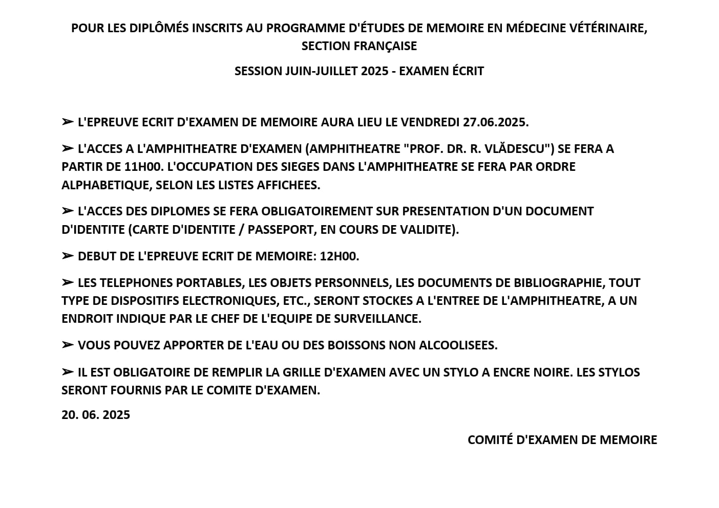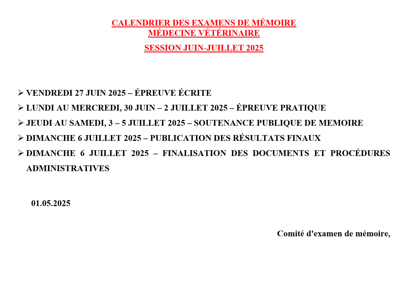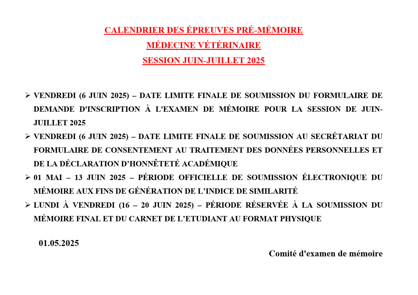 CALENDRIER DES EXAMENS DE MÉMOIRE